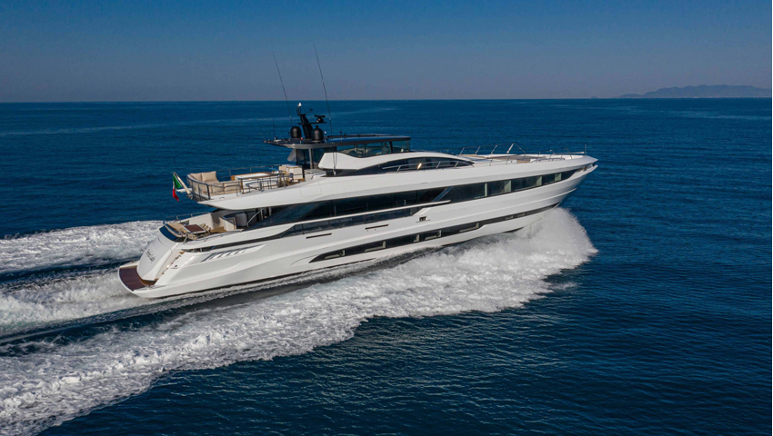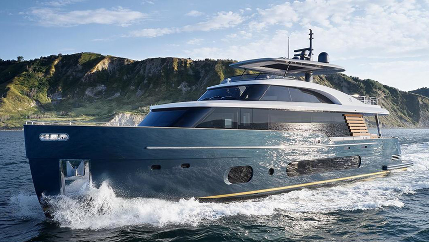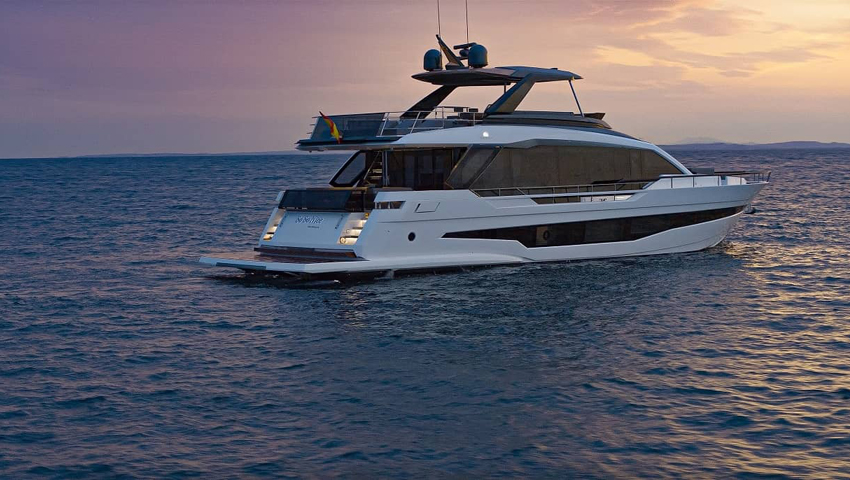 Azimut Magellano 25 Metri – It is a luxury yacht with a total length of 25.22 mt, it has an expandable platform to obtain an infinite terrace. The same panel, which also serves as a garage hatch, unfolds to create a wide bathing platform. Carbon fiber is used to increase volumes and surfaces while maintaining the same weight, which allows for excellent levels of dynamic stability.
