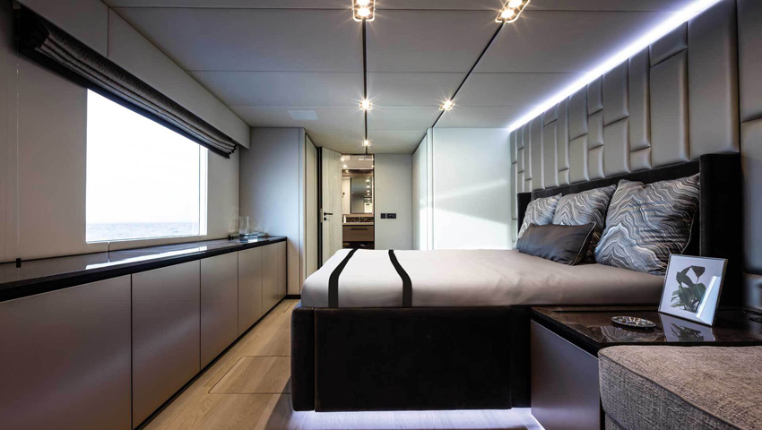 The interior of the catamaran, with layout and decoration according to the ideas and tastes of the owners, has 4 generous cabins to accommodate eight people in total luxury. Decor combines sleek contemporary furnishings with a subtle palette of neutral tones that complement the gleaming gold hull.