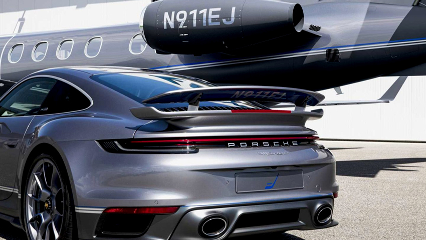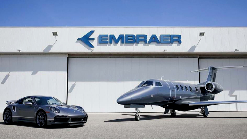 Jay Beever, Embraer's Vice President of Design added, “This is the perfect marriage between car and jet, personified with the collaboration's exclusive logo. This logo combines the aeronautical support requirement, represented by the Phenom 300E winglet, with the automotive requirement for grip on the runway, represented by the model 911 spoiler. To further solidify this symbiotic partnership, the aircraft registration number appears both on the wing rear of the car as well as the sides of the jet”.
