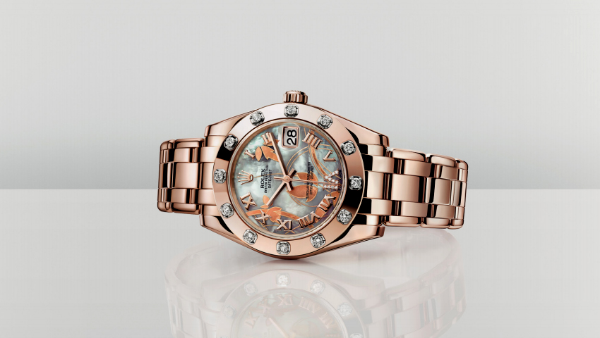 Um Rolex é obrigatório para a coleção de qualquer entusiasta de relógios. Caixa em ouro everose 18k com uma pulseira rolex pearlmaster em ouro everose 18k. Fixo, definido com moldura daimonds. Mostrador em madrepérola com ponteiros em tom de ouro rosa numeral romano preenchido com diamantes.