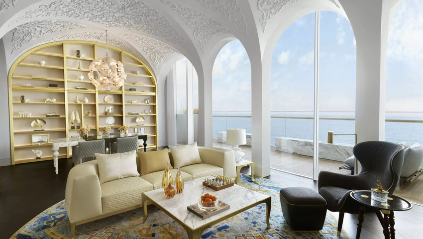 O luxuoso Fairmont Doha cinco estrelas inclui 270 quartos, 92 suítes, quatro suítes temáticas e uma suíte presidencial, todos inspirados nos interiores de mega iates de luxo. Com revestimento em mosaico dourado, e os quartos com paredes arredondadas e curvas.