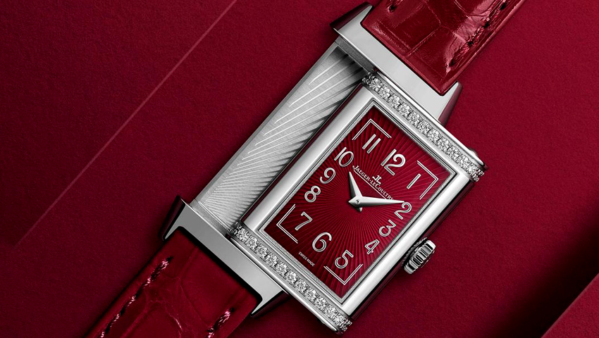 Mais uma versão feminina a Jaeger-LeCoultre apresentou um clássico mas não menos belíssimo relógio de nome Reverso One Red-Wine. Este magnífico relógio foi criado em 1931, o que faz dele um dos mais duradouros designs de relógios. Nesta nova versão, o mostrador é decorado com uma camada de laca vermelha brilhante sobre um padrão de raio de sol, rodeada por duas fileiras de diamantes.