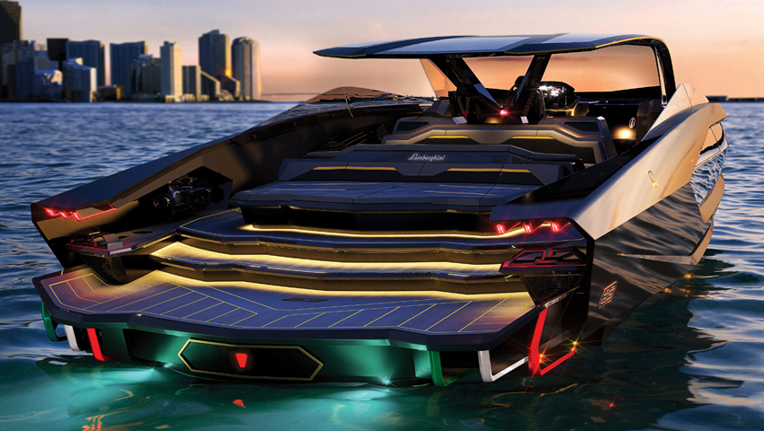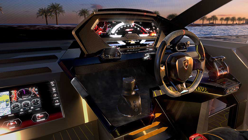 A sua iluminação de proa é uma consagração ao protótipo da Lamborghini Terzo Millennio e ao icónico Sián FKP 37, com os seus característicos faróis dianteiros cujo design tem a inegável assinatura distinta do estilo Lamborghini. No painel de instrumentos é uma interpretação náutica do ‘cockpit’ dos automóveis de luxo da marca do touro. Incluindo o característico botão Start/Stop da ignição, exatamente igual ao dos carros Lamborghini.