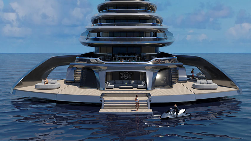 No convés frontal do iate está uma banheira de hidromassagem com espreguiçadeiras e um guarda-sol retrátil, uma grande piscina na parte traseira com vista para o clube de praia. Os futuros proprietários podem optar por adicionar um heliporto e hangar para melhor poderem disfrutar das aventuras no mar.